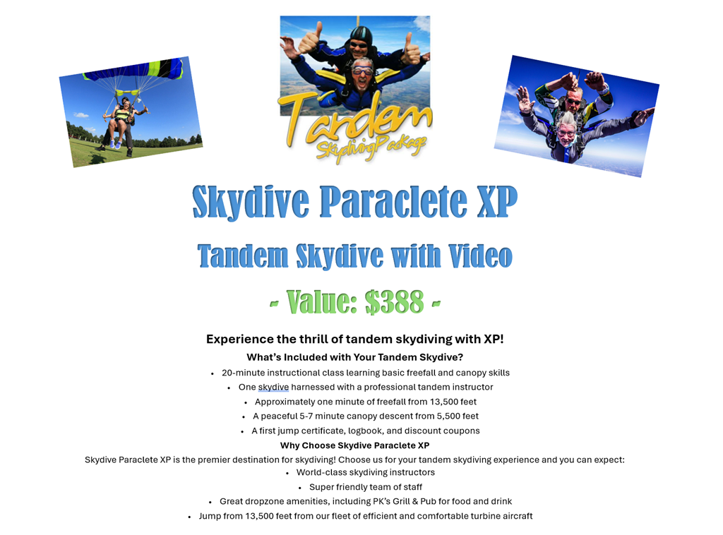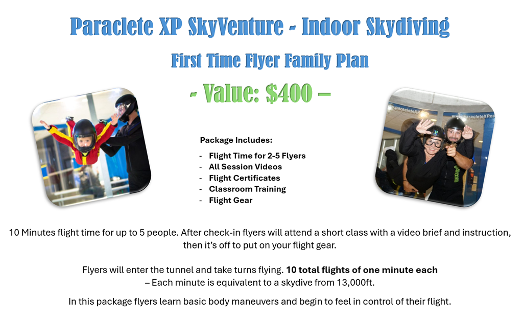This item, designed for the adventurous, takes place at Paraclete XP Sky Venture in Raeford, NC. ThIs package includes a Family Plan Indoor Skydiving and a Tandem Skydive with Video! Valued at $688. Visit: https://paracletexp.com/ for more information.